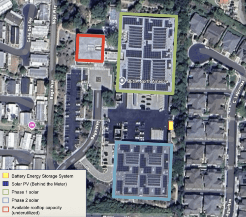 In partnership with HES Solar, a San Diego-based solar and battery storage installer, BEGA designed and deployed a Solar Microgrid consisting of 2,008 SunPower SPR-A450-COM solar panels and two Tesla Megapack batteries. The system functions as two distinct solar+storage configurations, deployed in two phases (see the image below). Phase 1(outlined in green) is sited on the northern manufacturing facility and consists of 560.7 kWdc of solar paired with 543 kW/2,172 kWh of storage. Phase 2 (outlined in blue) is located on the southern manufacturing facility and comprises of 318.6 kWdc of solar paired with 271 kW/1,087 kWh of storage. The two Tesla Megapack batteries (yellow with a red border)—each providing storage for a respective phase—are sited between the two manufacturing buildings. This enables BEGA to meet approximately 90% of its annual demand for electricity with onsite renewables, while providing up to 12 hours of resilience even during the worst-case outage conditions (e.g. a rainy day with maximum load usage).