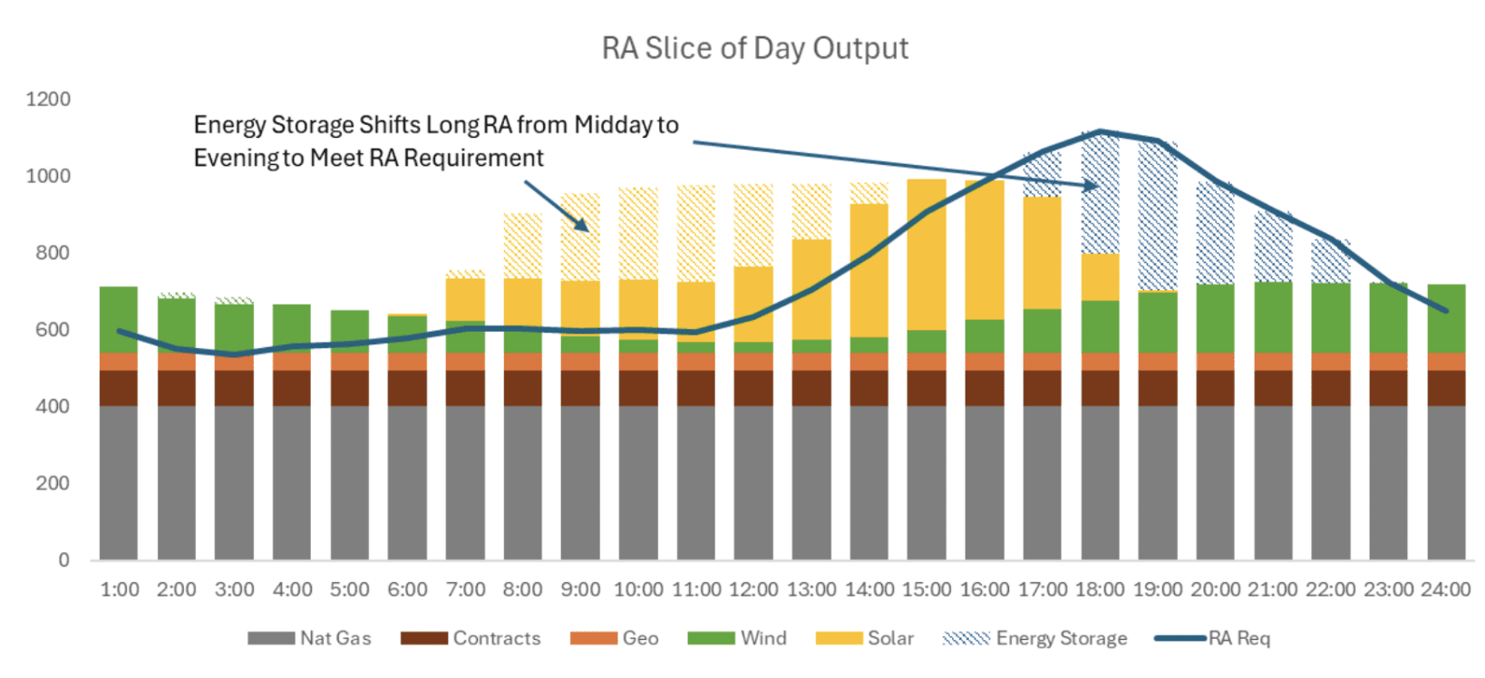The chart above shows the consistent reliance on natural gas as RA capacity and the ability of batteries to shift overabundant solar energy produced during the middle of the day to the daily peak—from 5-9 pm—when demand is the highest. In addition to the transition for slice-of-day, SB 1158 (Becker 2022) requires all LSEs to report the cleanliness of their energy portfolio on an hourly basis starting in 2028. This is a major change from the existing counting process, which requires each LSE to bank more renewable energy credits, on an annual basis, than total demand (in kWh). The policy alignment of transitioning to hourly reporting for both RA procurement and renewable content of the energy portfolio is pushing LSEs to participate in Energy Tetris. Albeit a challenging shift for LSEs, balancing load with generation on a far more granular basis than was previously expected poses an opportunity to utilize the existing grid more effectively and reduce ratepayer costs while supporting investments in renewable energy.
