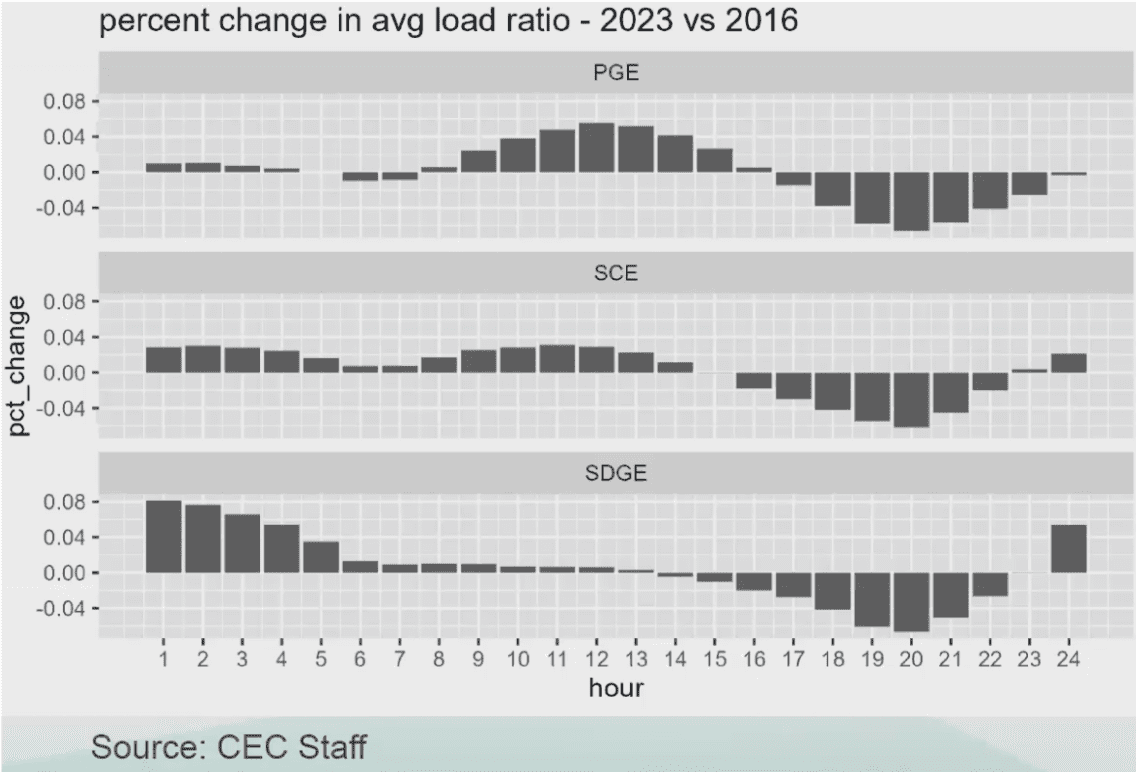 Between 2016 and 2023, the system load during peak hours has gone down and demand during the middle of the day (solar producing hours) has increased. This is an example of successful Energy Tetris.