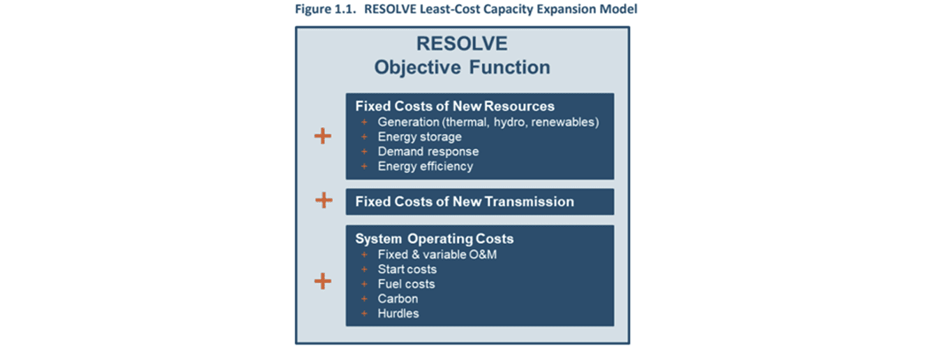 The third, and most fundamental issue, is the structural exclusion of DER,[1] especially FOM DER, from scenario planning in the IRP or SB 100 reports. In the IRP, the CPUC uses a capacity expansion model called RESOLVE, to select a least-cost energy portfolio. Because RESOLVE operates at a zonal transmission level and does not include a distribution planning component, FOM DER are not explicitly modeled as candidate resources. The result is an optimization that minimizes system generation costs at the transmission interface, while distribution-level constraints and infrastructure costs remain outside the objective function.