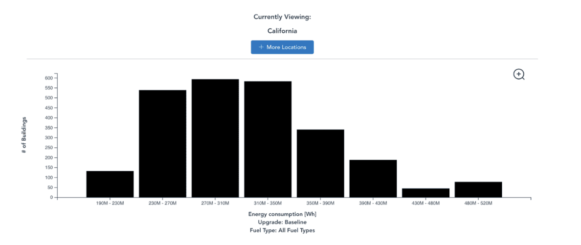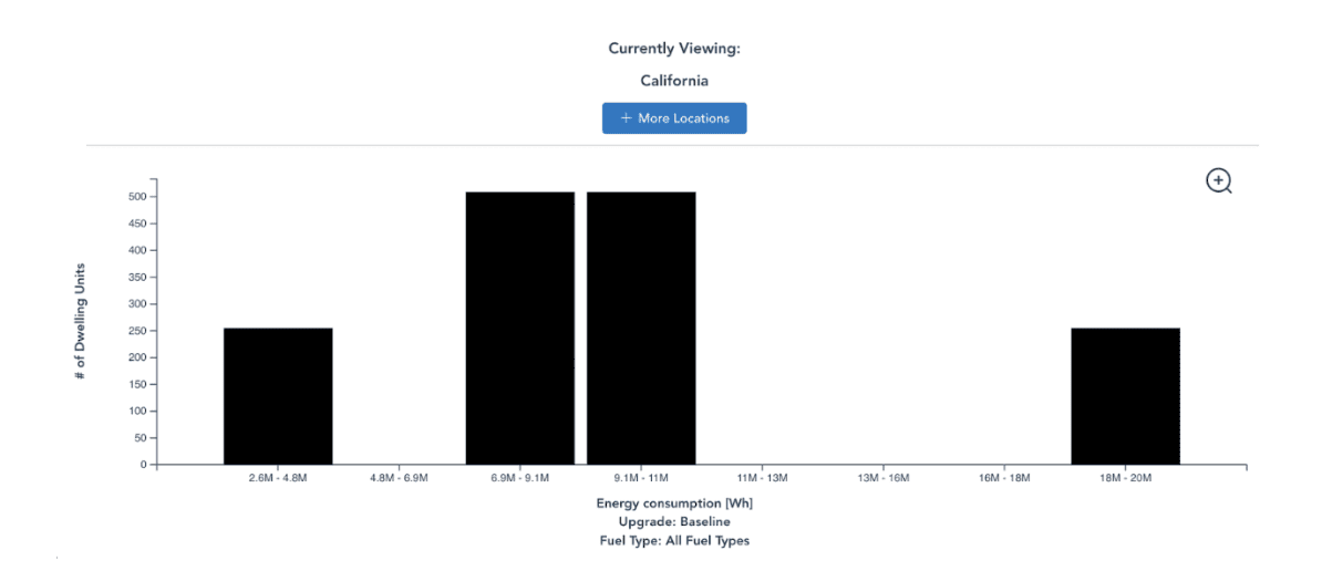 - The histogram shows the total number of buildings that meet the selected criteria. In the CSV file, divide the column titled “baseline.out.electricity.total.energy_consumption.kwh” by the total number of buildings from the histogram.