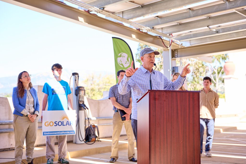 Clean Coalition’s Founder and Executive Director, Craig Lewis, spoke alongside Caleb Weis of Environment California, Jefferson Litten from the City of Santa Barbara, Michael Chiacos from the Community Environmental Council, and Leah Stokes from the Department of Political Science at UCSB during this in-person gathering hosted by Environment California. The event was held on Thursday, 12 March 2026 at 12 pm PST under the solar parking canopy at the Granada Parking Garage in Santa Barbara, CA.